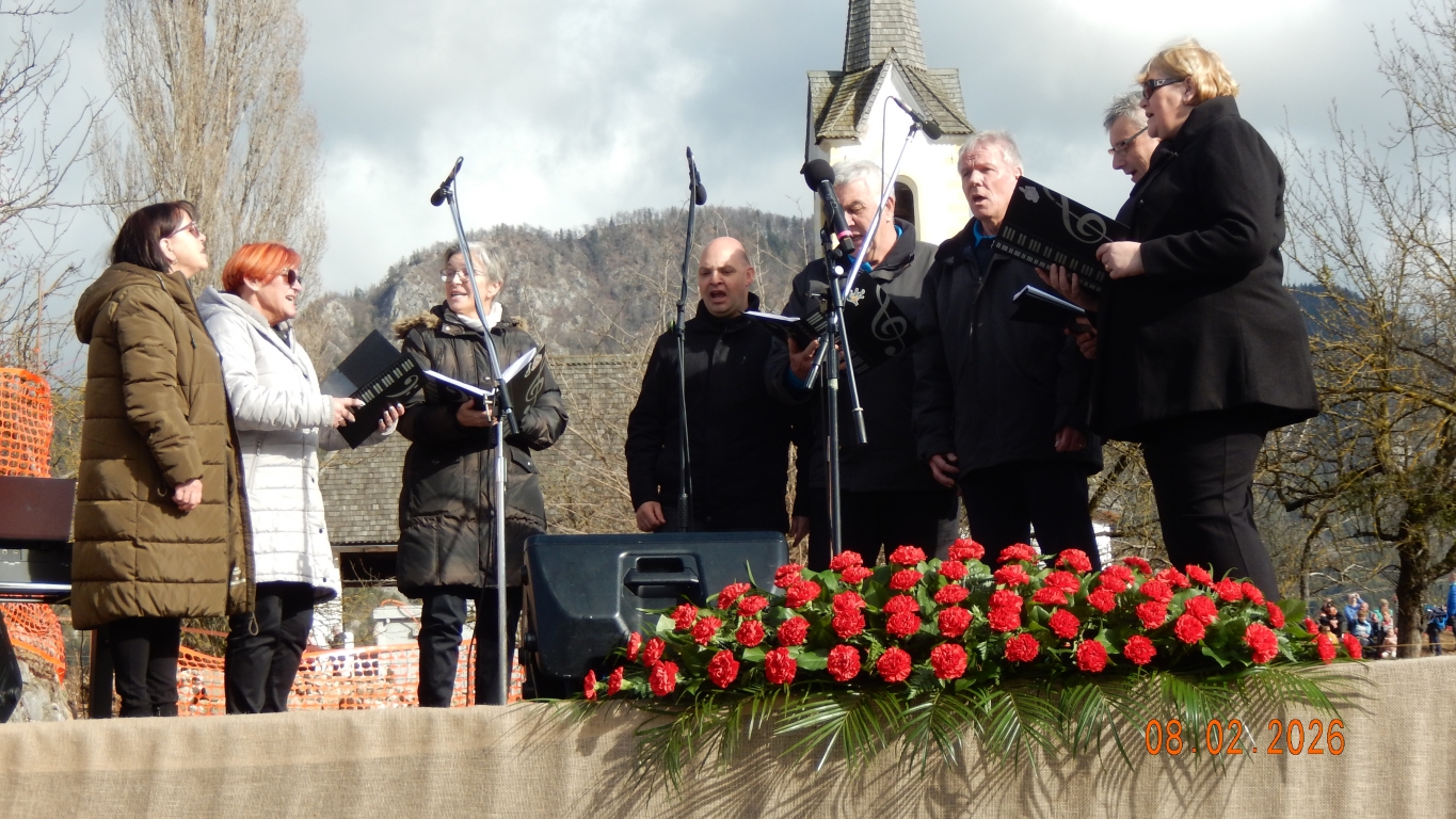 Sledilo je polaganje venca, postrij praporščakov, nagovor g. Leopolda POGAČAR, župana Občine Žirovnica, Slavnostni govor, govornice ga. Ksenije BENEDETTI in bogat glasbeni kulturni program Pevskega zbora in glasbenice Nuške Drašček z nastopom različnih skladb.